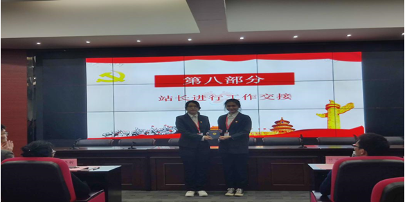会议第七项议程,党群服务站公布新一届干部名单。随后进行会议的第八项议程由第三届站长翁洁玲同志将党群服务站的工作交接给新一任站长钟铮真同志。