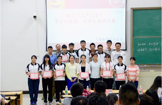 【本网讯】2015年11月19日晚7点整,工商管理系党总支在三水校区第一教学楼C207举行以“践行‘三严三实’,争当好党员、好学生”为主题的演讲比赛决赛。此次演讲比赛邀请了工商管理系党总支副书记赵小锋等8位老师担任评委。