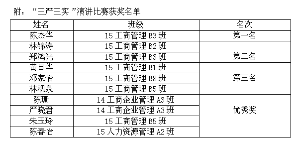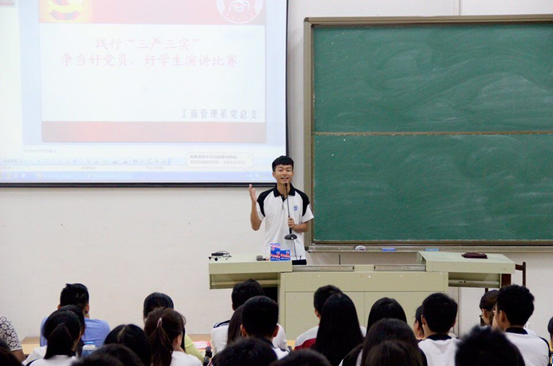 首先,主持人介绍比赛规则和流程。随后,来自14、15级的10位比赛选手依次上台演讲。大家都以饱满的激情和丰富的情感,全身心投入到比赛中,内容丰富的演讲,铿锵有力的语言,让全场观众热血沸腾。比赛中,选手们能够结合“三严三实”的内容进行演讲,并列举发生在身边的事迹进行更加深刻的诠释。经过激烈的比拼,最终来自15级工商管理B3班的陈杰华同学脱颖而出,荣获第一名。