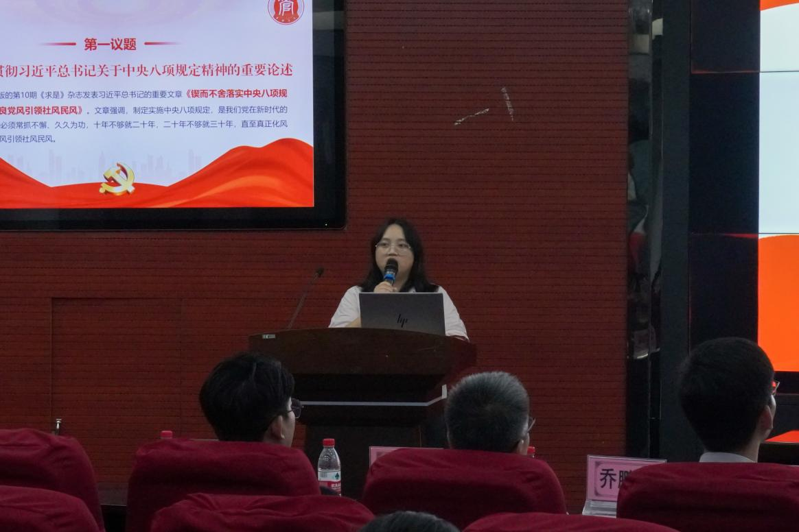 随后,由管理学院党委宣传委员张慧薇同志领学“第一议题”。张慧薇同志围绕贯彻落实中央八项规定精神展开深入讲解。她强调,强化理论武装是塑造作风的思想根基,党员干部要潜心读原著悟原理,深刻领会习近平新时代中国特色社会主义思想的历史地位、科学内涵等,提升对中央八项规定精神的思想认识,加强党性修养,让精神入脑入心化行。