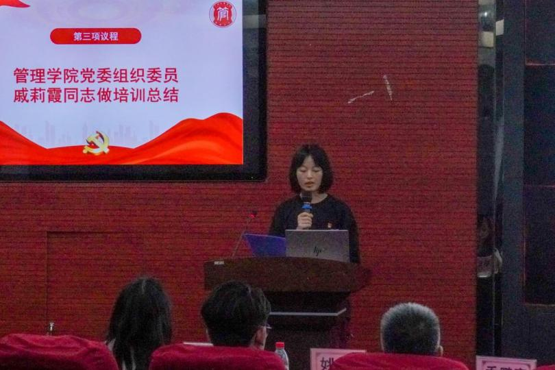 其次,由管理学院党委组织委员戚莉霞同志对本期党校培训工作做全面且深刻的培训总结。戚莉霞同志回顾了本期党校培训班严格规范的选拔流程与多元化的培养方式,肯定了学员们在理论学习与实践锻炼中的成长。随后,她对学员提出三点期望:一是要理论联系实际,做到知行合一,在学好专业知识的同时加强党性修养;二是要勇担社会责任,在校园内外发挥先锋模范作用,将历史使命转化为日常行动;三是要不忘初心、牢记使命,以青春之我投身民族复兴伟业,将个人理想融入国家发展大局,努力成长为信念坚定、行动有力、心怀大爱的共产主义者。
