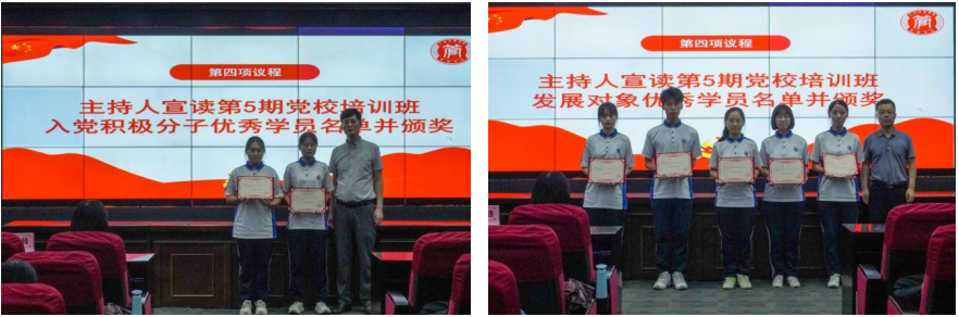紧接着,大会进入到优秀学员的颁奖环节。主持人宣读了第5期党校培训班入党积极分子优秀学员和发展对象优秀学员名单,并由管理学院党委副书记、党校副校长赵小锋同志以及管理学院党委书记、党校校长乔鹏亮同志分别为党校培训班优秀学员颁奖。