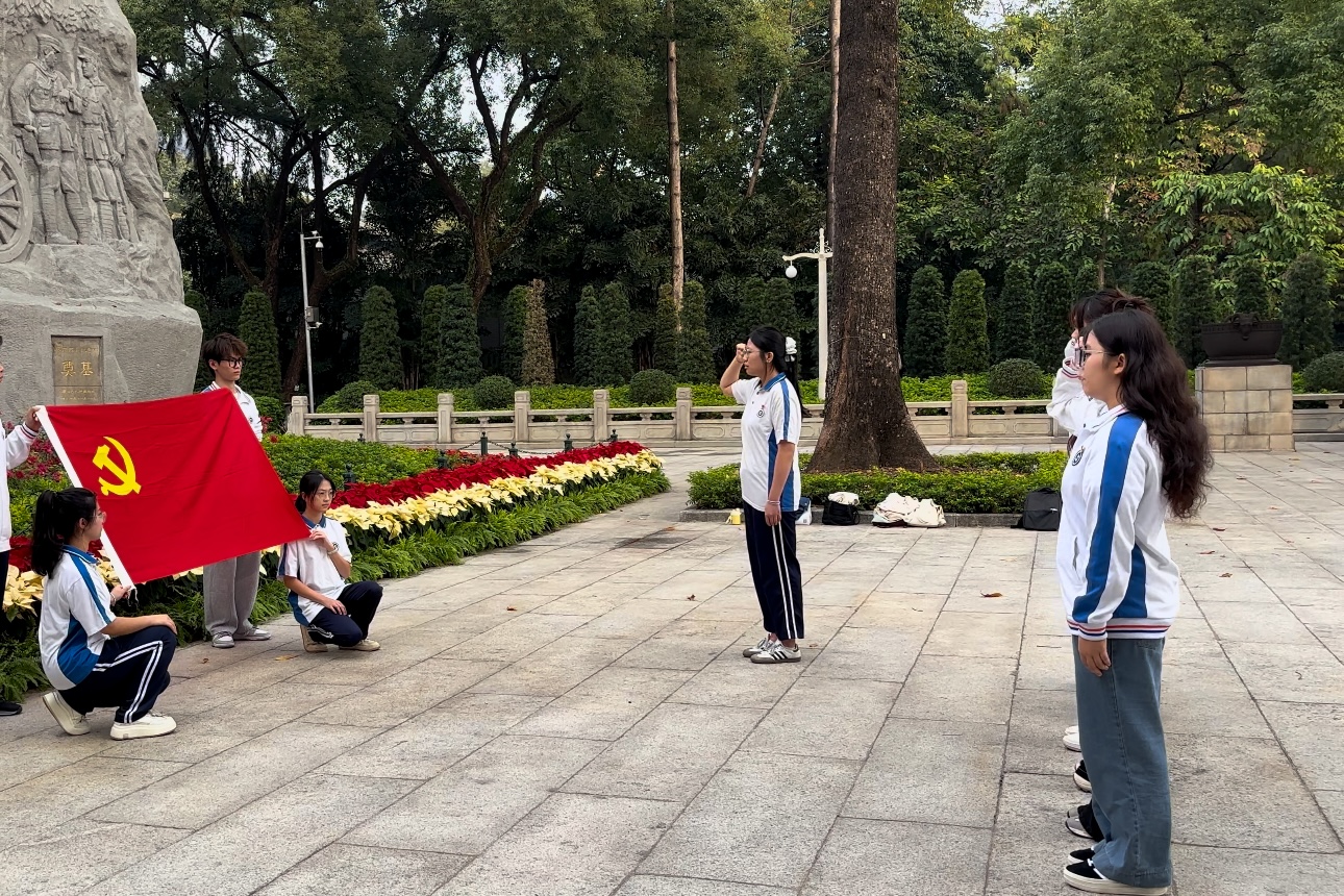 在广州起义纪念碑前,我们组织新一批预备党员入党宣誓仪式暨佩戴党员徽章仪式。老师们伸出双手,将党员徽章佩戴在每位预备党员的左胸前,指尖的温度传递着期许,党员徽章在灯光下折射出耀眼的光芒,牢牢定格在靠近心脏的位置。