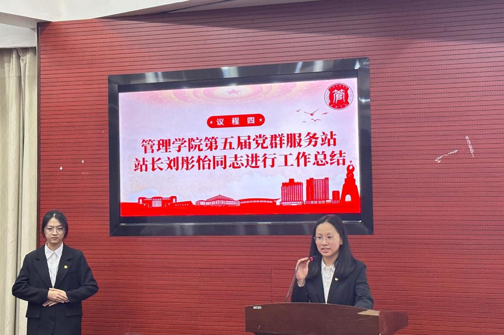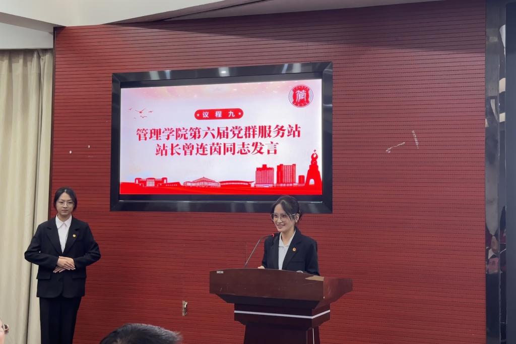 大会伊始,全体师生共同观看了管理学院第五届党群服务站年度工作回顾视频。随后,第五届站长刘彤怡同志对过去一年的工作进行总结,与大家一同重温了共同奋斗的点点滴滴。在党组织的引领下,党群服务站过“一月一观影”、“一日一故事”等活动筑牢思想根基;积极组织开展三江村植树、“三下乡”等服务实践活动,贴近群众需求;并借助宣传平台传播党群正能量。面对工作中的挑战,大家团结协作、共克难关,也在工作过程中收获了成长与情谊。刘彤怡同志向学院领导老师的悉心指导以及每一位成员的辛勤付出致以诚挚的感谢,并期待新一届成员能传承红色精神,在奉献与服务中续写更加绚烂的青春篇章。