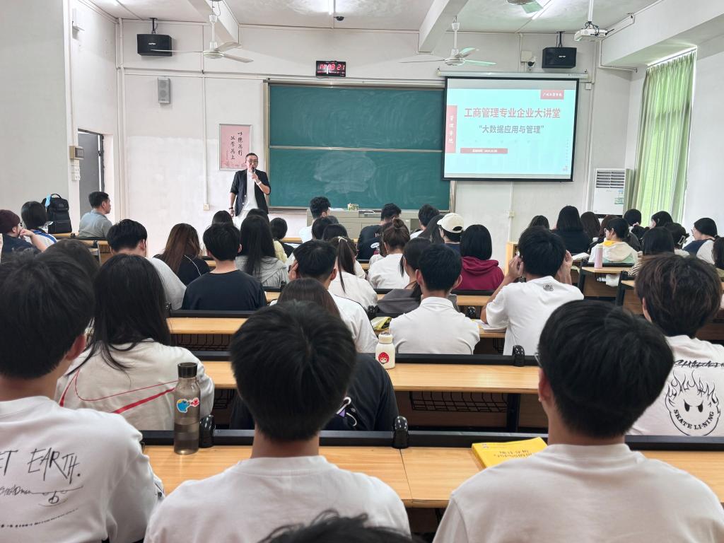 【本网讯】2024年11月05日,管理学院工商管理专业教研室在学院多功能报告厅隆重举办了主题为《大数据应用与管理案例分享》的企业大讲堂。此次活动特邀广州八斗软件科技公司董事长赵泛舟先生作为主讲嘉宾,面向23工商管理B1、B2班的同学们进行了一场精彩的讲座。讲堂由教师王保生老师开场,他首先对赵泛舟董事长的到来表示了热烈的欢迎,并简要介绍了大数据在当今社会中的巨大影响及其在各行业的广泛应用。