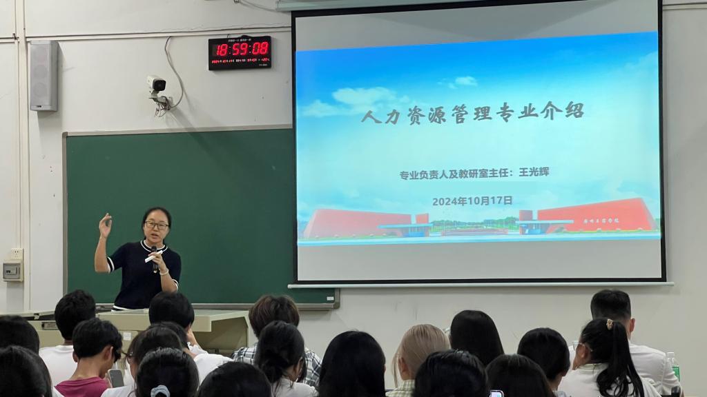 【本网讯】在秋高气爽的十月,为帮助2024级人力资源管理新生深化专业认知,稳固专业思想,树立专业自信,明确大学学业规划以及职业生涯发展,人力资源管理教研室于2024年10月17日为2024届的同学们带来了一场干货满满的新生专业教育讲座。本次讲座邀请了人力资源管理教研室主任王光辉老师和妥宏武老师作为主讲嘉宾,还邀请了往届的优秀毕业生作经验分享,为即将踏入大学校门以及对未来职业路径感到迷茫的新生提供了一个深入了解该专业的绝佳机会。