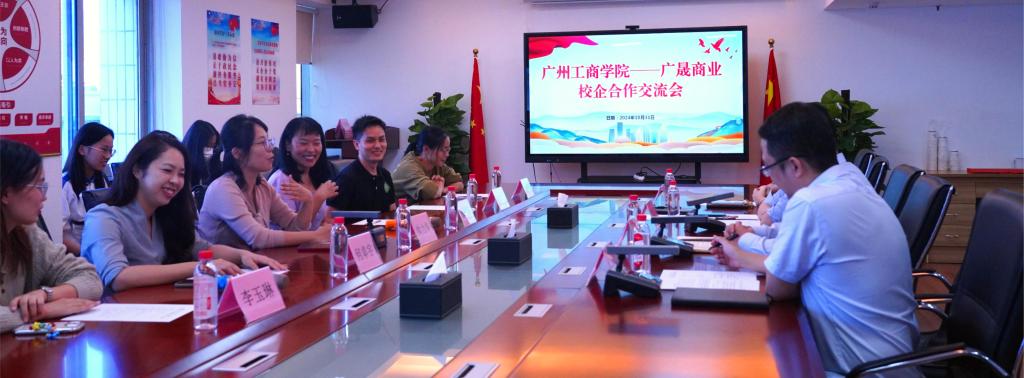 随后,双方于长城大厦6楼会议室举行了隆重的校企交流座谈会。广晟商业党委书记、执行董事徐新明,副书记罗宗文,党群人事部梁丽华部长、唐蓓部长,以及广工商师生代表共15人出席了会议。会议由梁丽华部长主持。