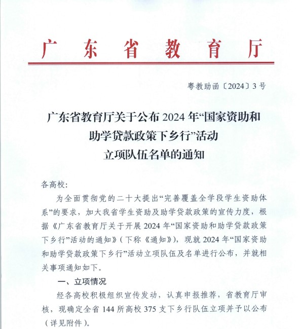 【本网讯】近日,广东省教育厅正式公布了2024年“国家资助和助学贷款政策下乡行”活动的立项队伍名单,管理学院筑梦志愿服务队凭借其出色的项目策划与扎实的准备工作,在众多竞争者中脱颖而出,成功获得省级立项资格,作为我院精心打造的资助代表队,成为了学校三支省级立项队伍中唯一的二级学院力量,体现了管理学院在志愿服务领域和对国家资助政策工作的重视!