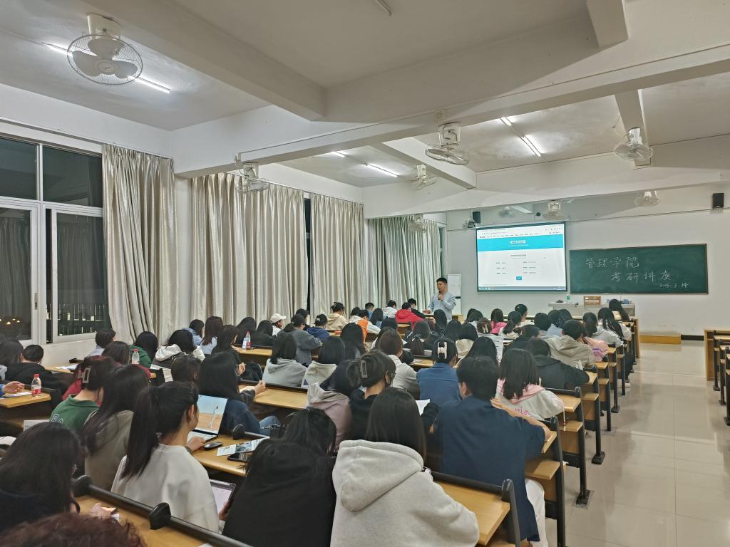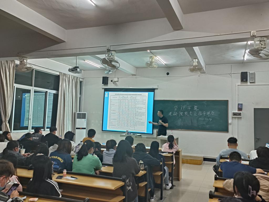为加强学风建设,帮助学生准确有效地确定就业方向,鼓励广大同学积极参加考研,尽快让他们在思想、行动上做好准备,提升学院考研率,2023年3月14日,管理学院在二教C402和C404举办两场考研公益讲座。此次讲座由学校考研中心的资深考研指导老师主讲,约200名20级学生参加此次讲座。