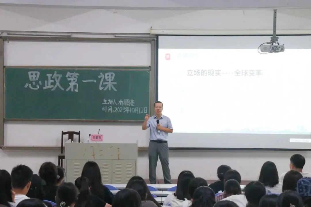 【本网讯】为了加强管理学院2023级新生对坚定立场、励志修能的理解以及对如何实现中华民族伟大复兴的认识。管理学院2023年10月12日在第一实验楼C107开展了思政第一课。本次讲座由管理学院党委书记、院长乔鹏亮主讲。