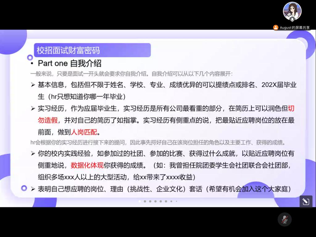 刘晓敏师姐目前就职于世界里强德科集团担任招聘一岗。她为我们详细介绍了以阿里巴巴为例有关简历投递、笔试、面试等方面的讲解,为我们介绍了如何设计和制作简历才能让HR眼前一亮,同时师姐也对我们同学所投递的简历进行逐一点评,指出我们简历存在的一些问题,比如有些同学的求职意向和地点不明确、主修课程写太多没有抓住重点、基本信息没有写全等问题。其中,师姐还指出我们最普遍的问题就是人岗匹配的问题。师姐针对每位同学简历中出现的问题提供了一些非常宝贵的修改建议,比如简历的设计要突出重点,且要用数据说话,最重要的是需做到人岗匹配。
