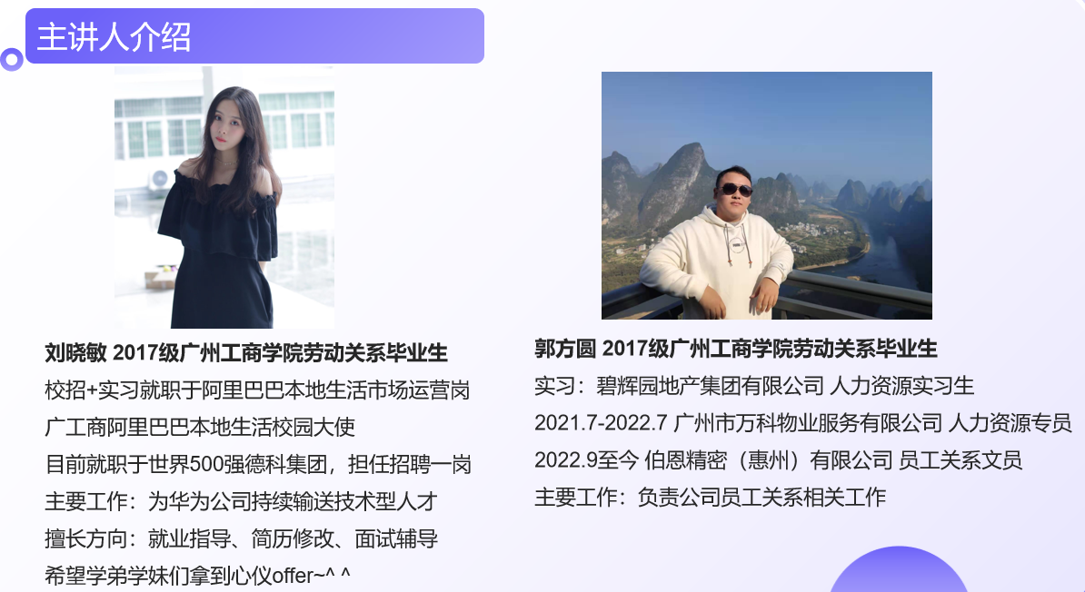 为进一步给即将毕业步入职场的师弟师妹们提供正确的就业指导方向,2022年12月15日晚上19:30通过线上腾讯会议召开了2019届毕业学生工作经验分享会。主讲人分别是刘晓敏师姐和郭方圆师兄,参加人员为ky开元劳动关系专业所有在校学生。