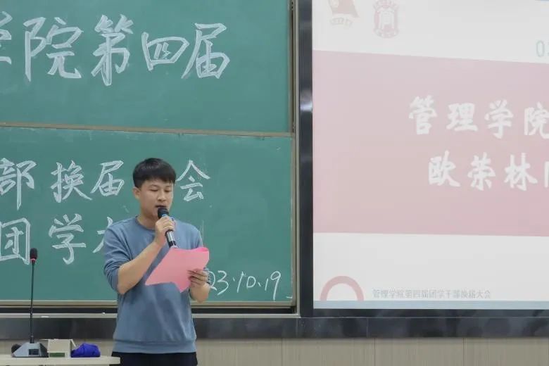 【本网讯】为进一步加强团学组织建设,使新任干事更加明确团委、学生会的工作内容与团学精神,使其更好地为广大师生服务,以及促进我院团学干部队伍新老交替,发扬“携手并进,勇往直前”的团学精神,培养一支勇于承担责任、维护校规校纪的优秀团学队伍,我院于2023年10月19日19:30举行了管理学院第四届团委、学生会章程学习暨成员培训大会。莅临本次会议的嘉宾有:管理学院团委、学生会指导老师欧荣林。