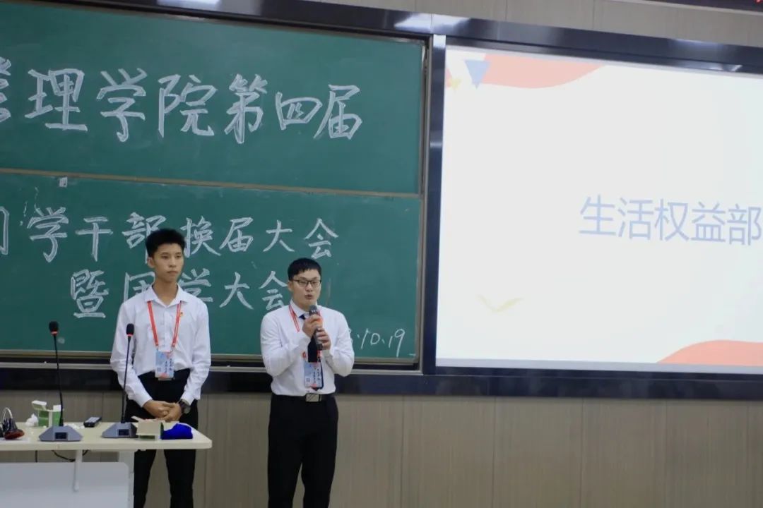 生活权益部刘梓枫向大家介绍了团学基本任务、组织架构,并带领新任干事一起深入学习团学制度和章程,同时向大家贯彻了管理学院 “携手并进,勇往直前”的精神,并勉励新干事能一直秉持这样的精神为广大师生服务。