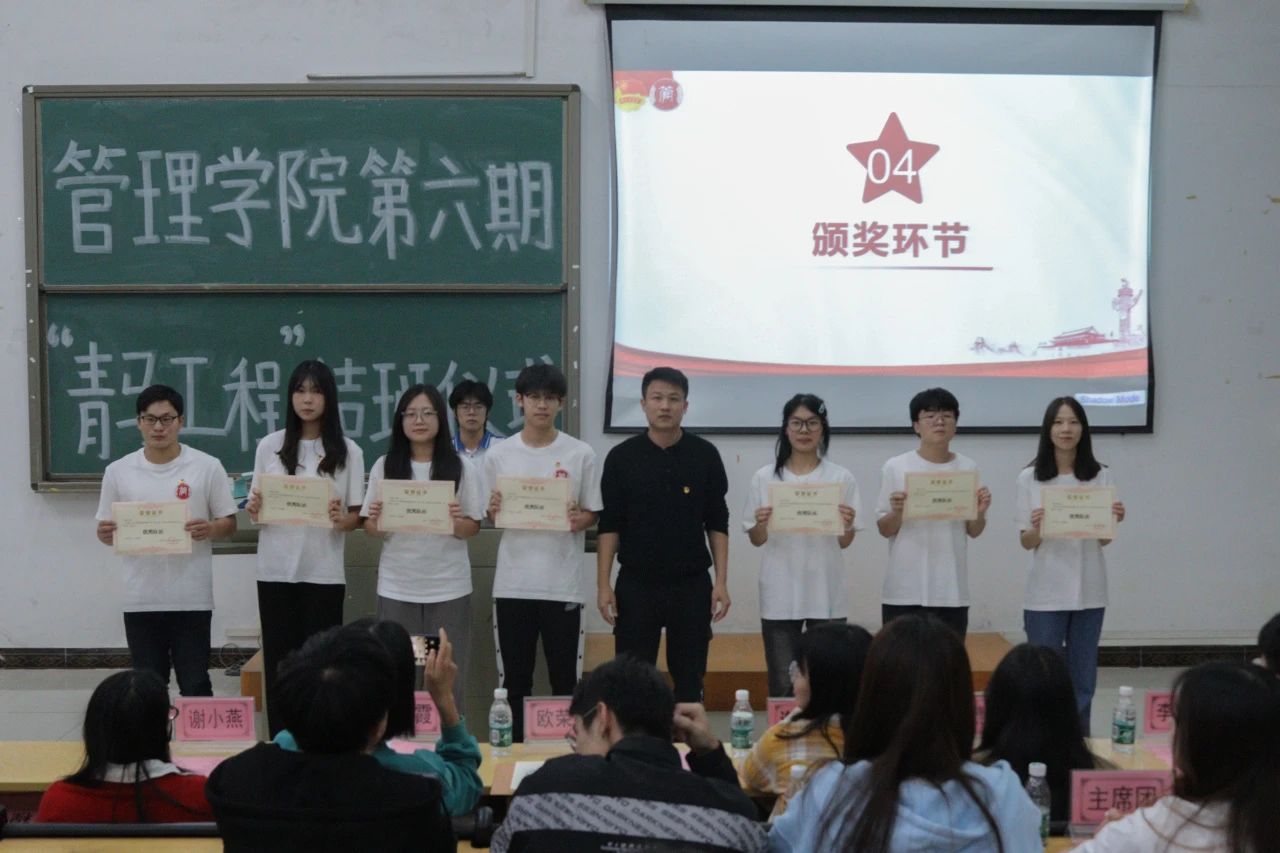 【本网讯】2023年11月22日晚19∶00,ky开元集团官网管理学院在第二实验楼C305教室举办管理学院第六期“青马工程”结班仪式。本次结班仪式邀请到了管理学院团委书记欧荣林同志、学生第一党支部书记戚莉霞同志、管理学院学生第三党支部宣传委员张慧薇同志、管理学院学生第三党支部书记谢小燕同志、学生第三党支部组织委员谢丽星同志、管理学院学生第六党支部组织委员李宇佳同志。