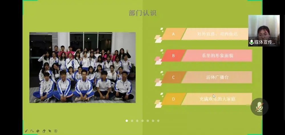 会议伊始,由办公室部长任少铧进行开幕致辞,简单介绍了本次竞选会议的流程及时间安排,总结在过去一年中部门工作的总体表现,并希望十四届的干部们能够稳稳握住接力棒,担起重任,在未来继续保持良好的工作态度,发扬团学,更好地为工商系服务。接着进入本次会议的重点演讲环节,各部门竞聘者根据要求对PPT内容进行演讲。部长们根据其演讲情况提出相应问题、做出假设考核各竞聘成员综合能力等考察。