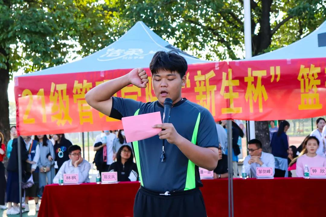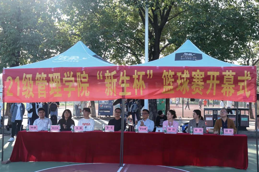 【本网讯】为积极践行“以德为行,以学为上”的教育思想,鼓励同学们参加“五进”之“进体育场馆”的实践活动,加强校园体育文化建设,丰富同学们的课余生活。2021年10月18日下午四点,管理学院迎来了2021级“新生杯”篮球赛。本次开幕式邀请了管理学院副院长邹剑峰副教授,管理学院学工办主任谭一酉老师,管理学院团委书记钟欣老师,20级级长姚舜老师,21级级长宋琪老师,19级辅导员林枫老师,21级辅导员郑文凤老师,21级辅导员程权老师。
