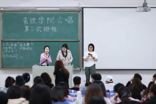 在正式比赛之前,我院合唱代表队在训练场地利用课余时间积极进行合唱排练,在短短的一周内,管理学院分团委书记钟欣老师和音乐指导老师宋琪老师多次出现在排练现场进行演唱指导,同时队伍总指导龙键枫同学和合唱指挥陈怡霖同学在现场有序安排人员站位和指挥合唱,参赛选手们也积极配合,不惧辛劳,认真训练。此外,管理学院分团委也准备了润喉糖帮助参演学生润喉下火,以便更好地为参赛做准备。