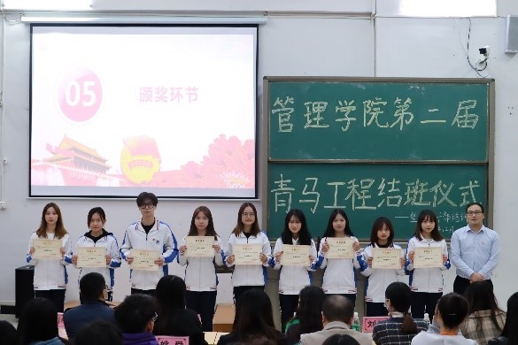 会议以观看视频共同回顾本次“青马”工程活动拉开序幕。队长林璋谕同学、学员代表林楷楠同学、学员代表刘佩哲同学依次进行发言。随后进入颁奖环节,曾广志老师、谭一酉老师、张永训老师分别对“青马”工程中表现优异的队长及学员进行表彰。紧接着,管理学院团委书记钟欣老师做总结发言。钟欣老师很欣慰看到了青马学员的进步,对青马幕后工作人员的付出表示了肯定,同时也对团学学生干部及干事提出期许,希望作为新时代中国特色社会主义未来的建设者,能够时刻牢记青马精神,不断提升为人民服务的能力,真正成为优秀的青年马克思主义者。最后,第二届“青马”工程结班仪式在热烈的掌声中落下帷幕。