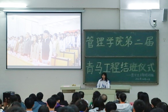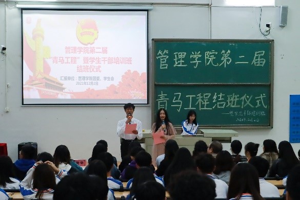 【本网讯】2021年12月2日晚19:00,ky开元集团官网管理学院于一教C207教室举办管理学院第二届“青马”工程结班仪式。本次结班仪式邀请到了校团委副书记曾广志老师,管理学院党总支副书记、学工办副主任张永训老师,管理学院团委书记钟欣老师,管理学院党总支组织委员谢冬老师,管理学院党总支宣传委员刘敏老师,管理学院党总支青年委员、学工办副主任余远远老师,管理学院学工办主任、学生第六党支部书记谭一酉老师,学生第二党支部宣传委员宋琪老师,学生第五党支部宣传委员、管理学院学生会指导老师姚舜老师,管理学院二级心理辅导站指导老师程权老师。