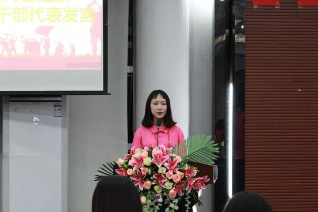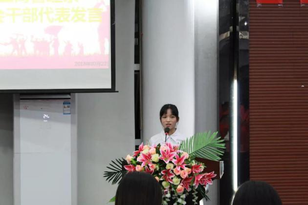 接着,上届团学生活部副部长林诗淇和本届团学文娱部部长杨俊玲做为代表上台发言。林诗淇同学对这两年团学生活进行总结,并寄语团学新干事,做人做事应端正态度,树立脚踏实地的为同学服务的意识,不忘初心。杨俊玲同学表达了对上一届干部们的感激之情,也希望干事们能保持初心,不轻言放弃,在团学中不断成长不断收获。