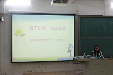 此次的讲座,使贷款学生深刻认识到诚信的重要性,增强学生的诚信还款意识,从而营造诚信氛围,树立学生诚信质朴的良好形象,以便用优异的成绩和良好的信誉回报社会。