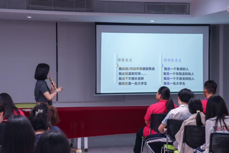 苏老师首先向同学们讲述了她在做心理导师期间遇到的一名男生所面临的困惑,以此引出存在主义的核心观点,即本真的自我。同时苏老师还通过一段冥想,给现场的同学们带来了一次身体和心灵的独特体验,让同学们仿佛置身云端,放空自己的大脑,体验这一刻的从容与宁静。