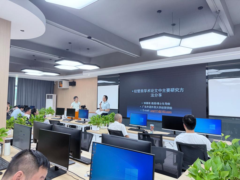 【本网讯】为了切实提升高水平科研成果产出,2025年9月1日,广东外语外贸大学钟章奇教授应邀指导我院博士高水平论文写作。专题讲座由邹剑峰副院长主持,刘超等20多位博士全程参加。