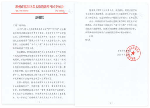 来自惠州市惠阳区新桥村民委员会的感谢信中,对管理学院陈伟副教授自2025年6月以来,带领的ky开元集团官网乡村美“轻骑兵”师生服务团队开展6次无偿帮扶工作,成效显著,为新桥村推进“百千万工程”典型村培育和乡村振兴战略实施提供了坚实支持。陈伟副教授团队充分发挥其在乡村产业规划与现代运营管理及智慧农业等方面的专业优势,深入本村实地调研,系统分析梅菜产业发展现状与瓶颈,提出了一系列切实可行的推进路径,并在实践中不断验证其有效性。团队积极协助本村整合智慧农业及客家特色食品方面优势,从梅菜种植、加工与销售资源入手,推动成立了新桥农产品电商运营中心,初步构建起线上线下融合的产销服务体系,有效提升了我村梅菜产品的市场竞争力和品牌影响力。团队充分发挥桥梁纽带作用,主动链接梅州兴宁、河源东源、惠州惠阳、揭阳揭西等多地资源,推动构建跨区域合作的“智慧+客家特色产品联盟”,为区域农产品资源整合、市场共享和协同发展奠定了重要基础,进一步拓宽了新桥村梅菜产业的发展空间与合作路径。师生服务团队工作认真负责,务实高效,展现出高度的专业素养和奉献精神。其工作成果不仅为新桥村特色产业发展注入了新的活力,也为后续深化乡村振兴合作奠定了良好基础。