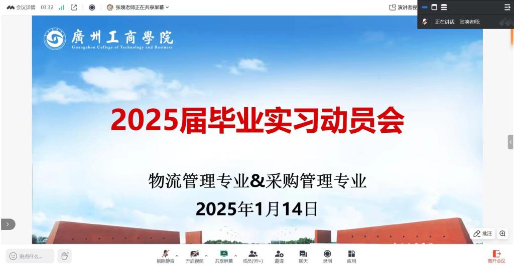 【本网讯】2025年1月14日,物流及采购管理专业教研室召开2025毕业实习动员会。此次动员会汇聚了两个专业的全体实习指导老师以及即将奔赴实习岗位的全体学生,旨在帮助学生充分认识毕业实习的关键意义,深入了解实习大纲与方案,确保实习安全有序开展。由于学校上周已结束考试离校,因此本次会议采用线上腾讯会议的形式展开。会议由采购管理专业教研室主任张塽老师主持。他指出,毕业实习绝非简单地走过场,而是学生将大学期间所...