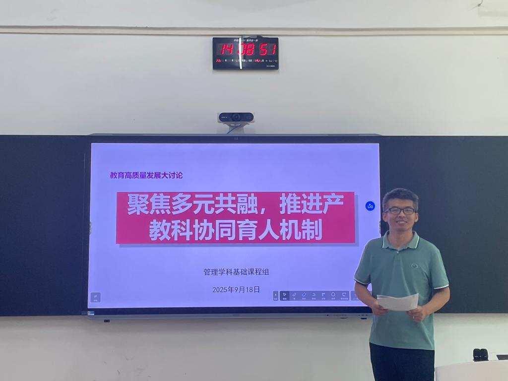 【本网讯】2025年9月18日下午,管理学科基础课程组在教Ⅱ-C104教室开展了高质量发展大讨论活动。本次会议由任德孝博士主持,妥宏武博士、张艳博士、杨建军副教授、黄登斌副教授、张紫璇老师共同参与了本次会议。通过本次讨论活动,老师们分享了优秀的产教融合案例,促进了管理学科基础课程组教学质量的提升。统计分析软件课程任课教师张紫璇率先分享了基于多元共融的教学内容设计,即在将来的统计分析软件课程中利用企业数据驱...