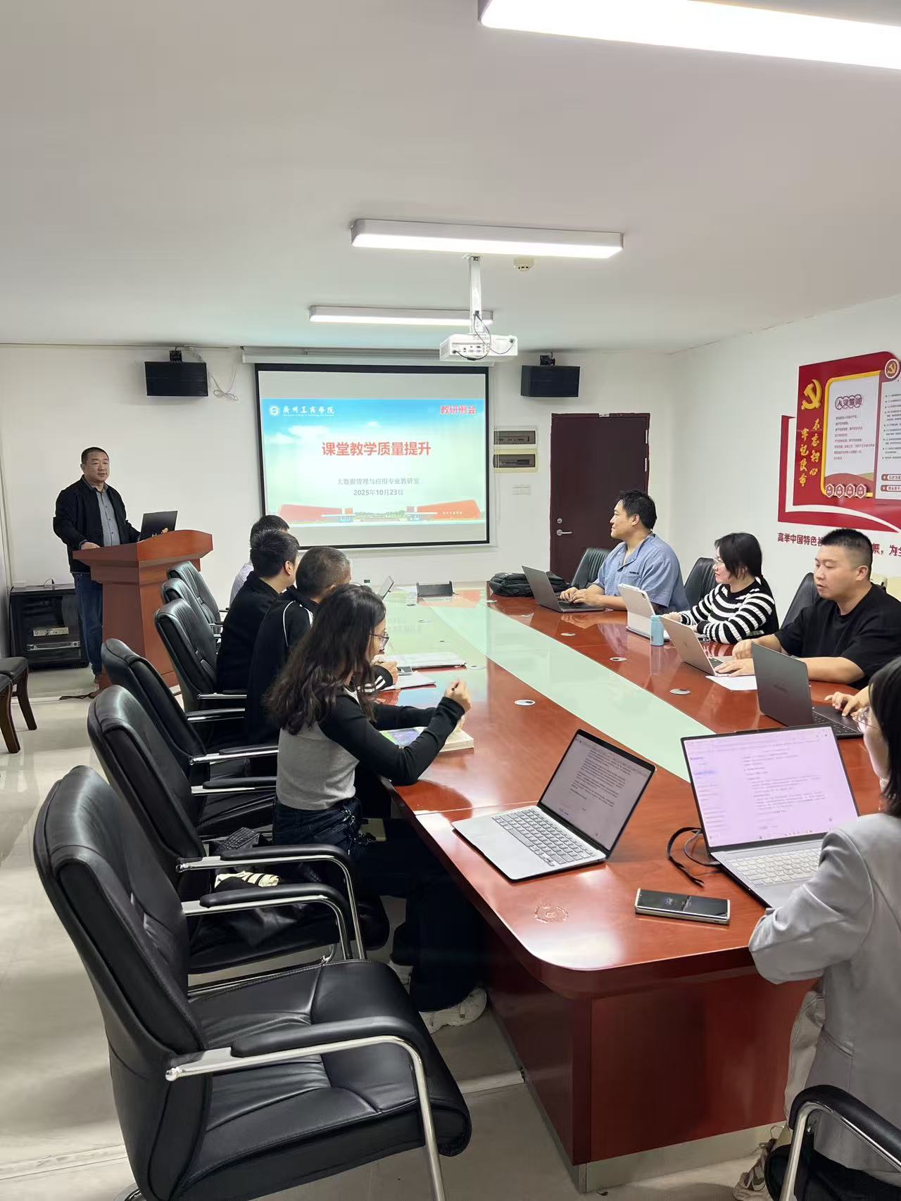 【本网讯】2025年10月23日,管理学院大数据管理与应用专业教研室成功召开"课堂教学质量提升"专题教研会议暨新学期工作部署会。本次会议聚焦教学改革创新与人才培养质量提升,为新学期各项工作指明了方向。教研室全体教师齐聚一堂,共商发展大计。在教学研讨环节,会议确立了以"学生认知与行为变化"为核心的教学质量观,倡导"教无定法、有教无类、教学相长"的教学理念。教研室提出将深入推行"三情分析"机制,要求教师精准把握学...