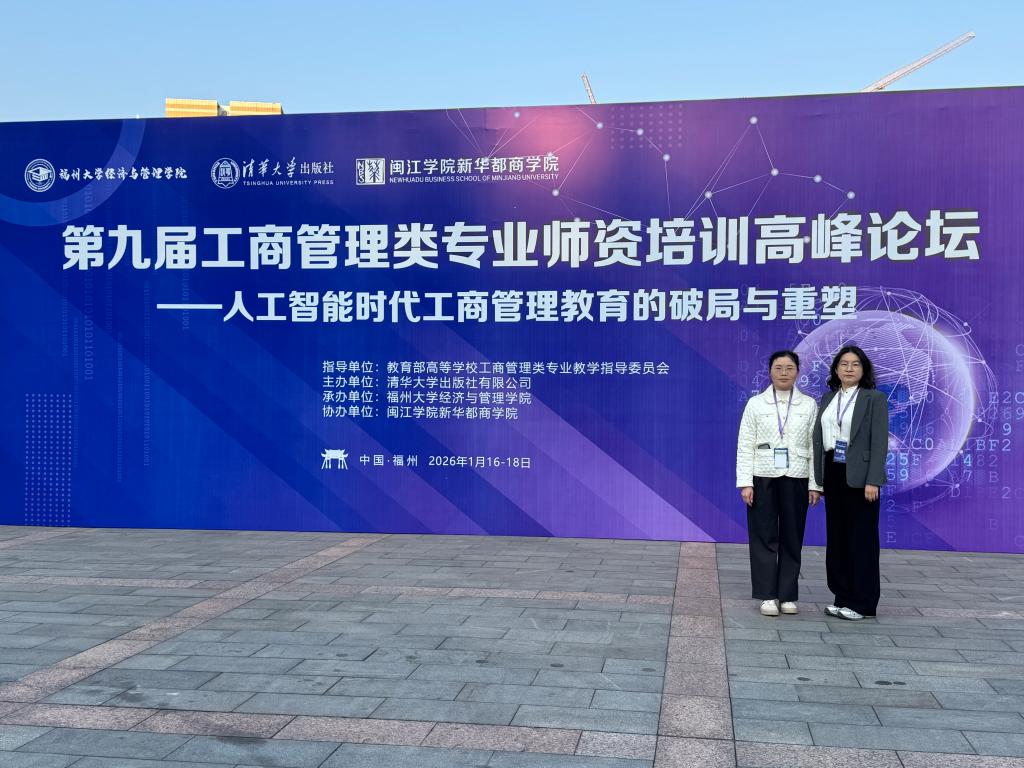 【本网讯】2026年1月16-18日,第九届工商管理类专业师资培训高峰论坛在福州举办。大健康与管理学院副院长梁春树、运营管理课程组负责人柳颖参会,与来自全国各高校的专家学者、骨干教师齐聚福州大学旗山校区,围绕“人工智能时代工商管理教育的破局与重塑”这一核心主题,共同探讨新时代工商管理教育的改革路径与发展方向。本次论坛由教育部高等学校工商管理类专业教学指导委员会指导,清华大学出版社主办,福州大学经济与大健...