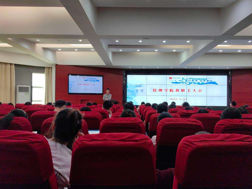 【本网讯】2023年3月23日下午2:30分,管理学院在办公楼322报告厅召开本学期第二次全体教职工大会。本次会议由乔鹏亮院长主持,全院教职工出席了会议。会议开始由乔鹏亮院长向大家介绍了最新入职报到的13位教职工。随后,乔鹏亮院长向大家汇报了学院近期工作的一些成绩,鼓励老师们除了保证日常教学工作外,也要积极参与教学竞赛和指导学生竞赛;同时也指出目前学院工作存在的一些问题,要求大家以迎评的态度认真对待工作。而...