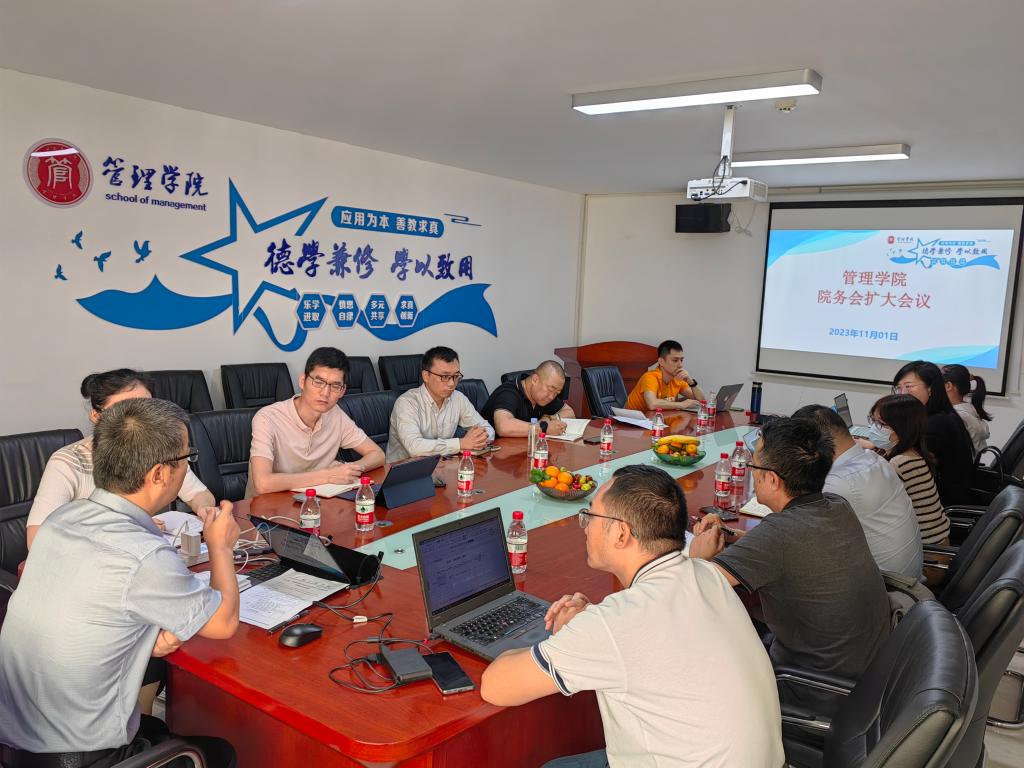【本网讯】2023年11月1日上午,管理学院在院部楼624召开院务会扩大会议,旨在就近期工作布置及采取措施进行深入讨论。会上,与会人员共同研究分析了管理学院的工作情况,并提出了一系列具体措施和安排,以进一步提升学院的管理水平和办学质量。在《管理学院院务会扩大会议》中,会议提出需要统筹管理学院人员名单,合理安排各项工作及对接工作人员。其次,对于本科合格评估材料的归档,会议要求制作PPT并上交自评报告,同时对支...