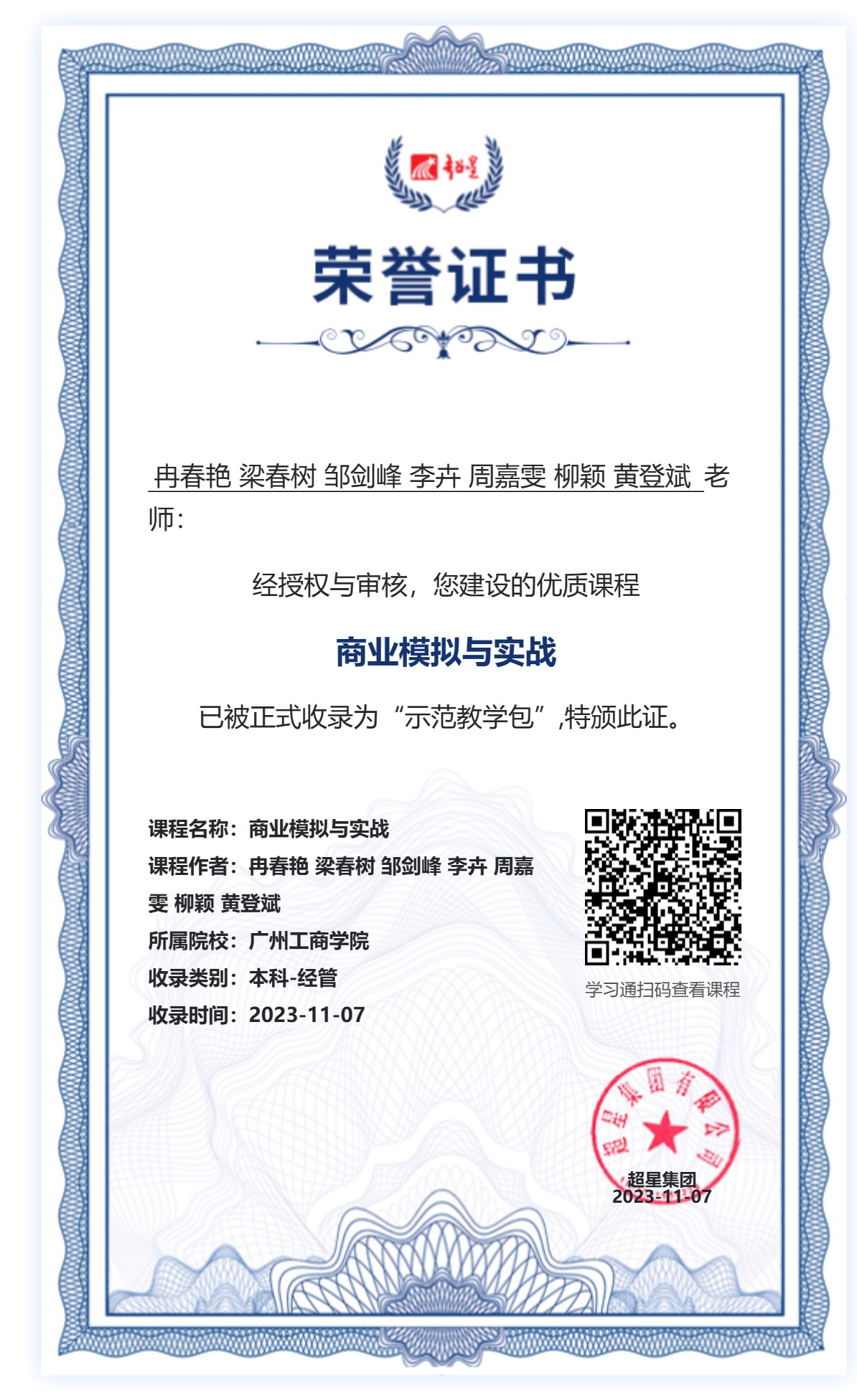 【本网讯】11月7日,我院由冉春艳、梁春树、邹剑峰、李卉、周嘉雯、柳颖、黄登斌老师精心制作的《商业模拟与实战》线上课程,以课程框架清晰完整、授课视频制作精美、教学资源丰富多样等突出优势,经超星公司专家评审,被评为优质课程并收录为“示范教学包”,超星集团向课程负责人冉春艳副教授颁发了示范教学包的荣誉证书。以上教师长期从事《商业模拟与实战》的教学活动,积极投身教学方式变革,善于在课堂教学中应用现代化信...