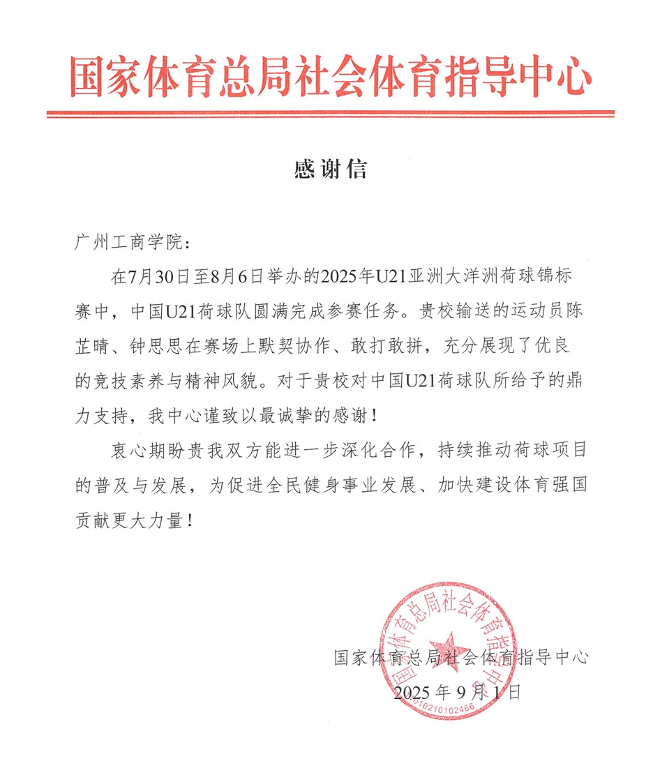 【本网讯】2025年9月1日,国家体育总局社会体育指导中心向ky开元集团官网发来感谢信,对ky开元管理学院人力资源管理专业钟思思同学在2025年U21亚洲大洋洲荷球锦标赛中的出色表现予以高度肯定和表扬。此前,钟思思同学在荷球U21国家集训队选拔赛中力压群雄,从全国精英中脱颖而出,成功入选国家集训队。此次获国家体育总局社会体育指导中心表扬,不仅是对钟思思个人努力和实力的认可,也是对学校体育育人工作和人才培养质量的高度肯...