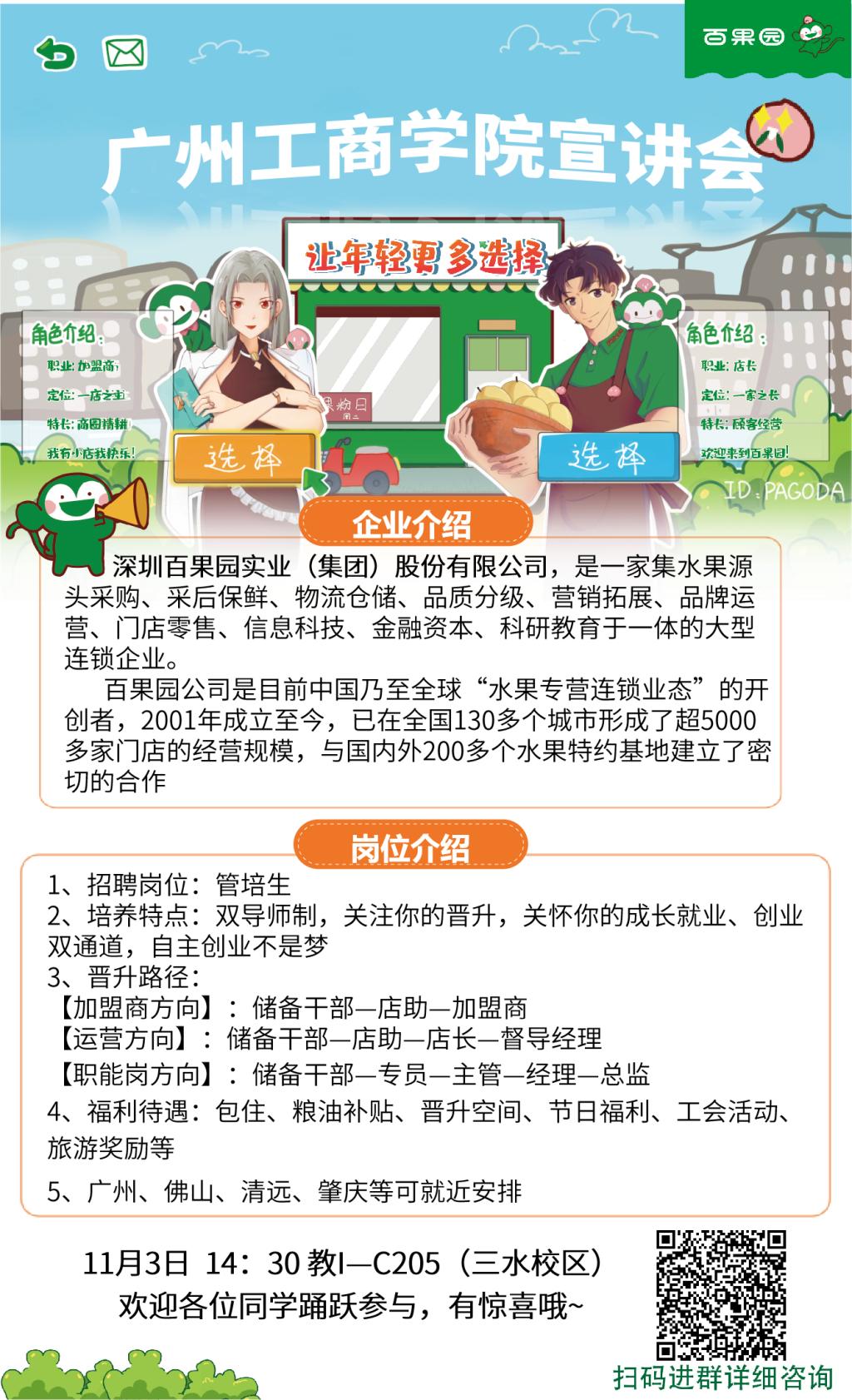 【本网讯】为了让应届毕业生接触更多就业机会,深圳百果园实业股份有限公司2022年广工商专场校招原计划于11月3日线下举行,后因疫情影响改为11月4日线上举行。会上,百果园公司负责校招的纪楚珊女士向同学们介绍了百果园“让年轻更多选择”的企业理念,并详细分析了支持百果园20年发展的原因以及百果园的三大满意战略,使同学们更深入地了解百果园的体系和理念。随后,纪女士阐明招聘人才的要求和计划,介绍了员工需要学习的内...