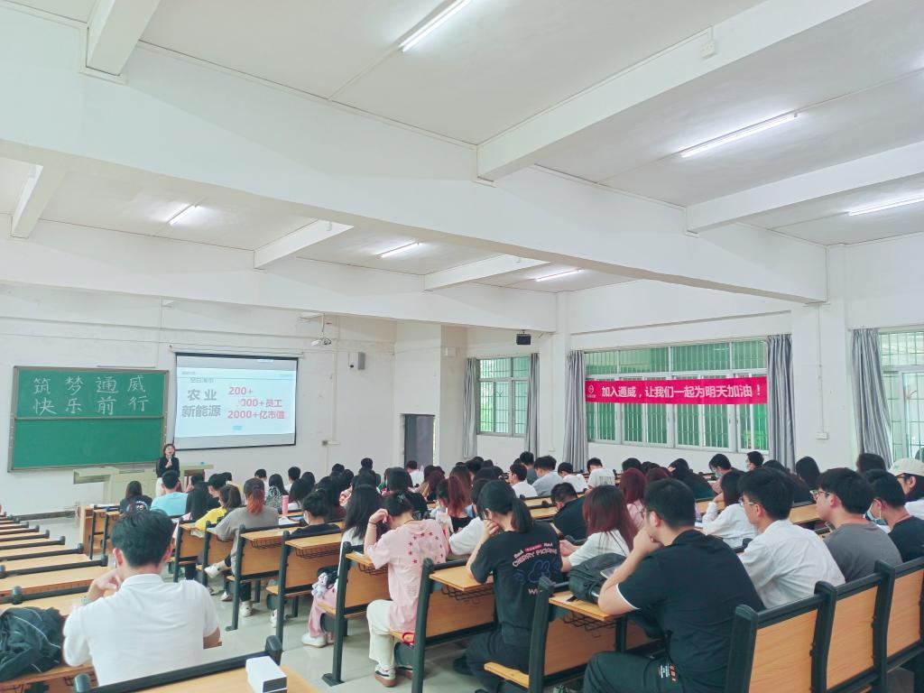 【本网讯】2022年11月17日,通威饲料股份有限公司在第二实验大楼C305举行宣讲招聘会,我院2019级近百名学生参加宣讲。公司负责招聘的唐海云经理从公司业务、员工职业发展、培训学习、薪酬与福利、岗位需求等方面进行详细的介绍;2019级工商管理专业毕业生伍国柱师兄分享了实习期及近3年来的工作情况,勉励学弟学妹们把握机会,尽早找到自己满意的工作。宣讲会结束后,近50名同学投递简历并参与现场面试,经面试后,15名同学收到...