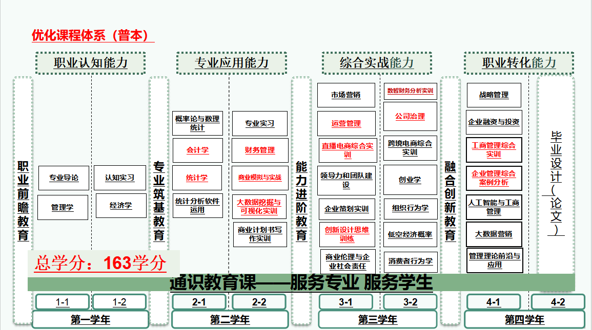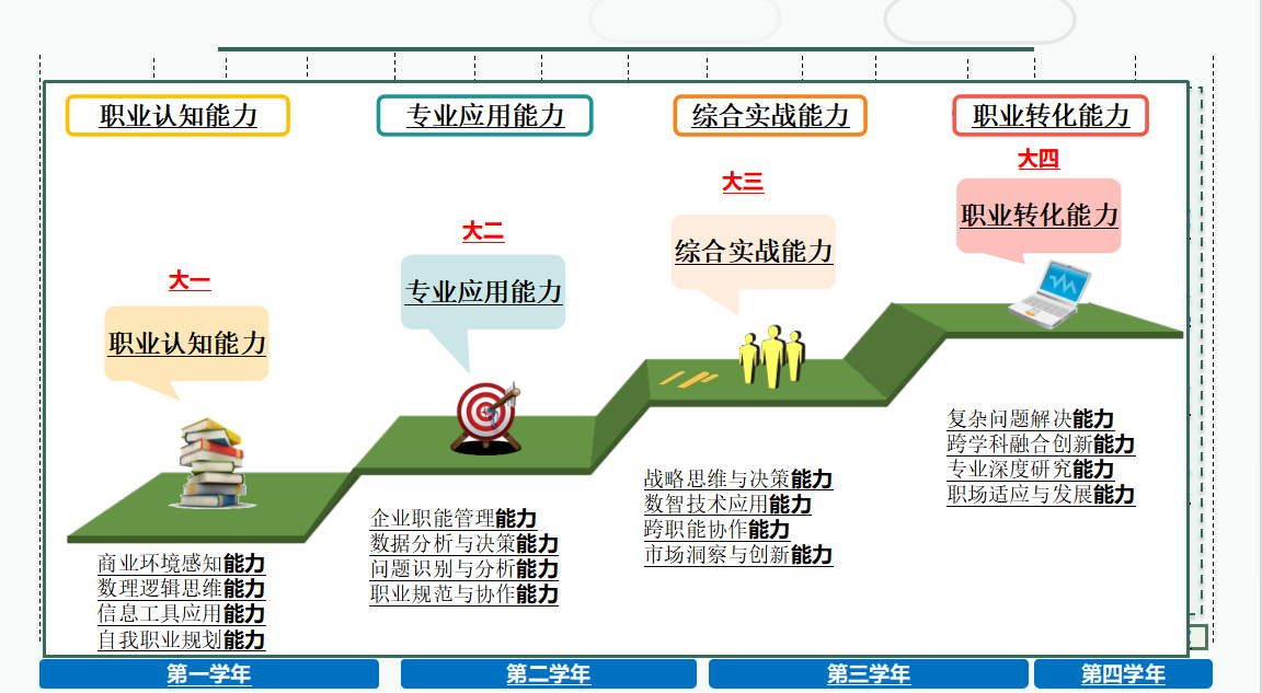 打破传统学科壁垒,以能力螺旋式上升为主线,系统构建大一职业认知、大二专业应用、大三综合实战、大四职业转换的四阶递进知识供给体系。通过融入数理逻辑、数据分析与战略决策等前沿内容,真正实现从基础理论到跨界创新的全面赋能,为学生构筑坚实的职业竞争力底座。