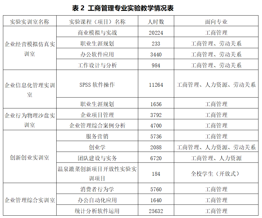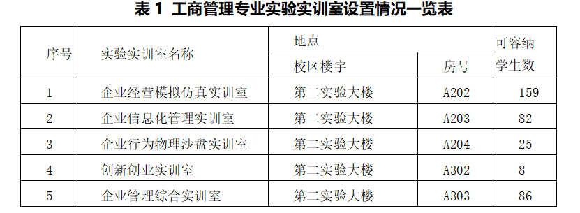 目前已经建成了1860平方米的“工商管理综合仿真实验教学中心”,其中包括企业经营模拟仿真实训室、行为观察和面试访谈室、企业信息化管理实训室、企业行为物理沙盘实训室,实干邦·广工商创新创业实验教学开放区、企业管理综合实训室,配备了包括新道新商道沙盘系统教学软件、SPSS统计系统、财务管理实训系统等相关软件,可以满足《商业模拟与实战》《财务管理》《统计学》《市场营销》《人力资源管理》等20多门专业必修、选修课和综合实训课约118个实验实训项目的教学需求。