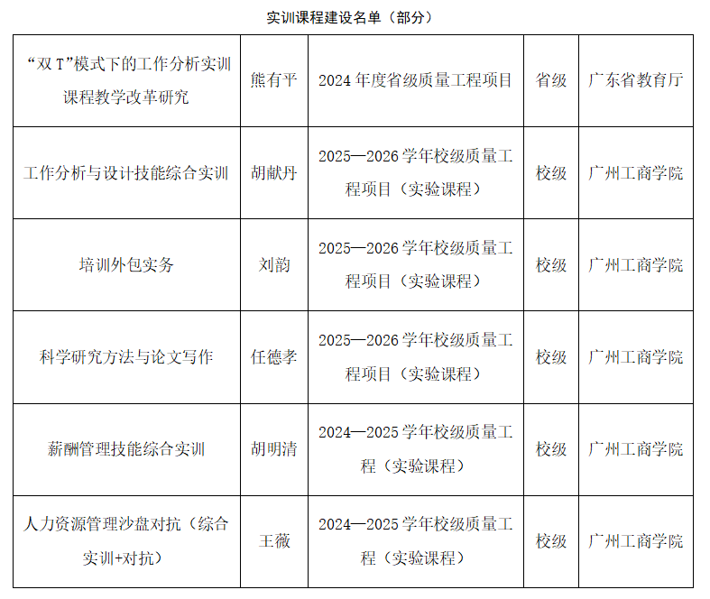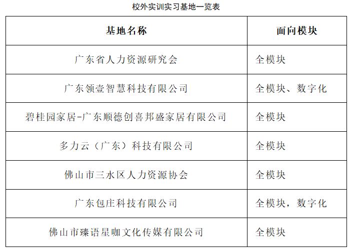 依托广东省人力资源研究会平台,构建“校—行—企”三元协同培养机制,打破校企壁垒,实现教育链与产业链无缝衔接。目前已建成5间校内实训室、7家校外实训基地,覆盖人力资源全业务场景,为学生提供从模拟操作到实地实操的全流程实践平台。与企业联合制定人才培养方案、开展科研项目、互聘师资,企业一线专家全程参与教学,让学生直面行业前沿动态与真实业务场景,破解应用型人才培养“实训短板”难题。