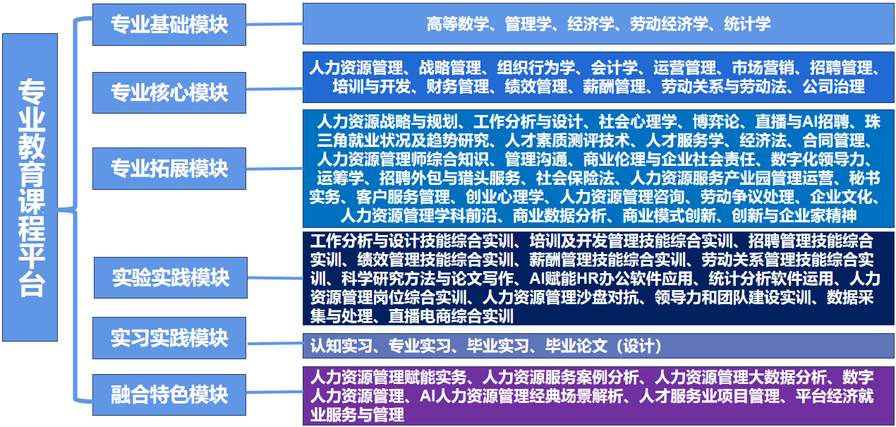 本专业培养服务区域经济社会发展,德智体美劳全面发展的社会主义建设者和接班人。掌握人力资源管理专业基础理论、基本知识,具有管理学、经济学、心理学、法学、人工智能、数字化转型等基本素养,具备数字素养、领导力、人力资源管理各职能实践能力,能够在人力资源管理、人力资源服务等领域发展的高素质应用型人才。