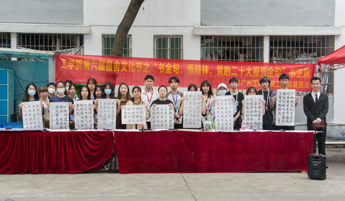 【本网讯】翰墨丹青歌盛世,浓墨重彩写华章。为响应学校“第六届宿舍文化节”的号召,推进“一站式”学生社区综合管理模式建设,创新“一站式”学生社区党建和思想政治工作模式,落实党建工作下沉学生宿舍,打造鲜明特色党团社区。2023年5月10日下午,我院在学生公寓8栋举办工学院学生社区系列活动之书金句,悟精神—党的二十大报告金句书法展活动。