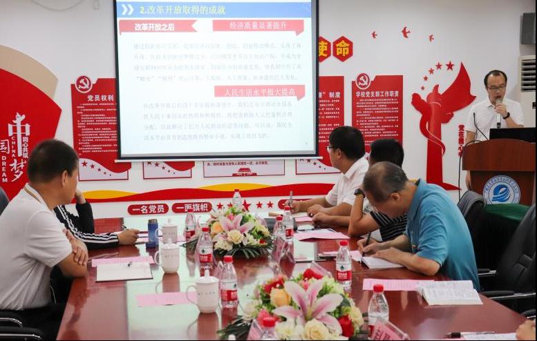 工学院党总支常务副书记罗俊同志作为分享发言人,以“伟大历程-改革开放40年”为题,结合工学院的发展和与会党员分享了自己的学习体会。罗俊同志从经济发展、民生福祉、社会生产力、科学技术、文化事业等方面,介绍改革开放取得的瞩目成绩,通过结合与中国人民息息相关的衣、食、住、行等,更加深刻的展示了改革开放所带来的生活水平的大幅度提高。罗俊同志提到:学院师生党员在学习党史的过程中,正不断汲取改革开放征程中的精神力量,贯彻落实立德树人根本任务,以持续的奋斗赢得更大幸福。