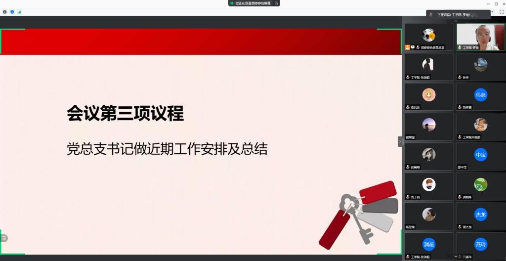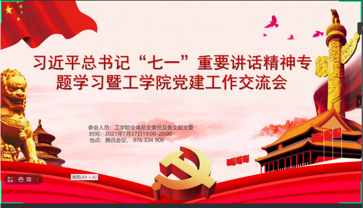 【本网讯】为学习贯彻习近平总书记“七一”重要讲话精神,领会重大意义、科学内涵、精神实质和实践要求,为实现第二个百年奋斗目标和中华民族伟大复兴的中国梦贡献青春力量,2021年7月27日19:00工学院党总支委员及各支部支委在腾讯会议参加了习近平总书记“七一”重要讲话精神专题学习暨工学院党建工作交流会。本次会议由工学院党总支书记罗俊同志主持。