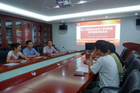 【本网讯】为提高我院学生电信诈骗的自我范防意识。5月14日中午,工学院党总支于院部楼412开展深入学生宿舍防诈骗宣传动员大会,参会人员有党总支书记罗俊同志、党总支副书记钟伟同志及党总支全体委员。本次会议由罗俊同志主持。