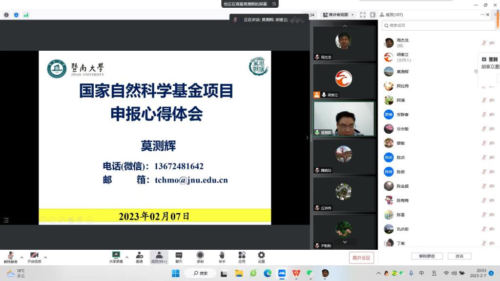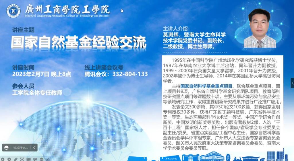 2月7日晚,工学院通过腾讯会议组织全体教师召开了国家自然科学基金项目申报经验交流分享会。会议邀请了暨南大学生命科学技术学院党委书记、副院长,国家自然科学基金重点项目获得者莫测辉教授分享申请国家自然科学基金项目的心得,全体专任教师参会。会议由副院长胡垂立副教授主持。