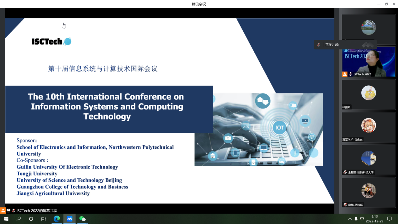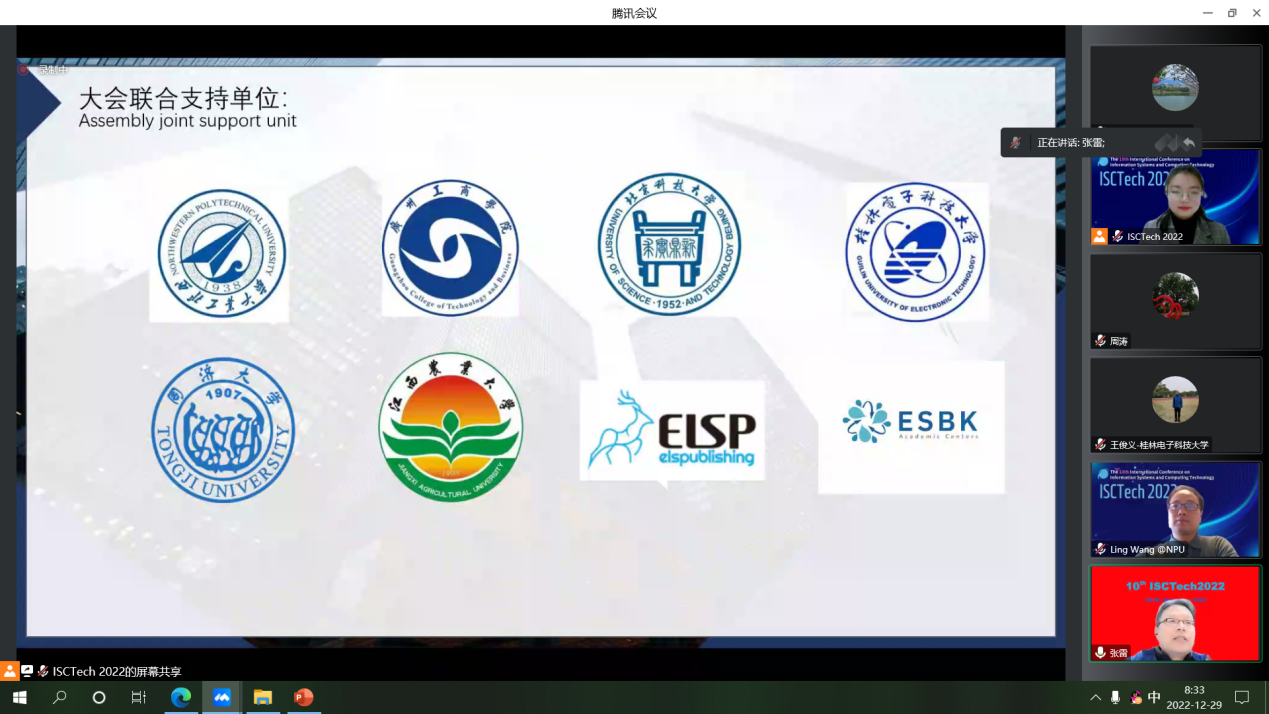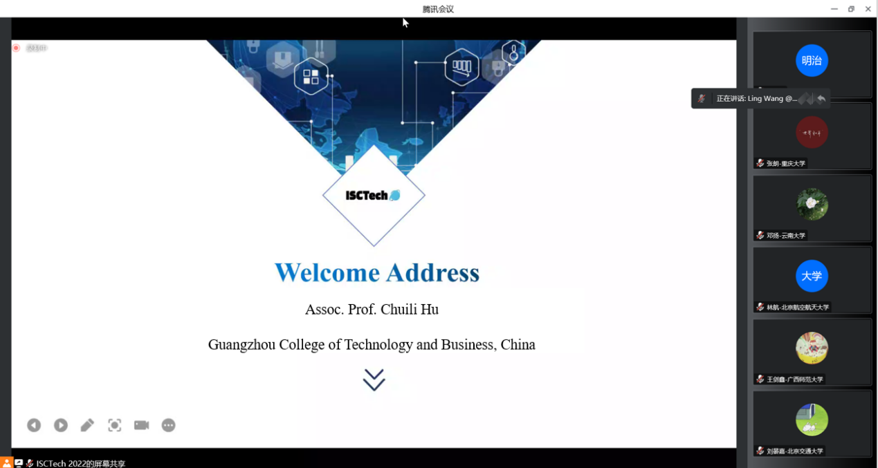 受疫情影响,原计划在桂林漓江大瀑布饭店召开的ISCTech 2022改为线上举行。开幕式上,会议联合主席、同济大学的张雷教授主持开幕式。西北工业大学的电子信息学院院长王伶教授、桂林电子科技大学的信息与通信学院副院长王俊义教授、ky开元集团官网工学院副院长胡垂立副教授分别做了欢迎致辞。胡垂立副院长在介绍了学校的基本情况后表示,ky开元集团官网工学院积极参与并开展国际学术交流与合作,先后与多个高校、企业建立了多种形式的交流与合作。