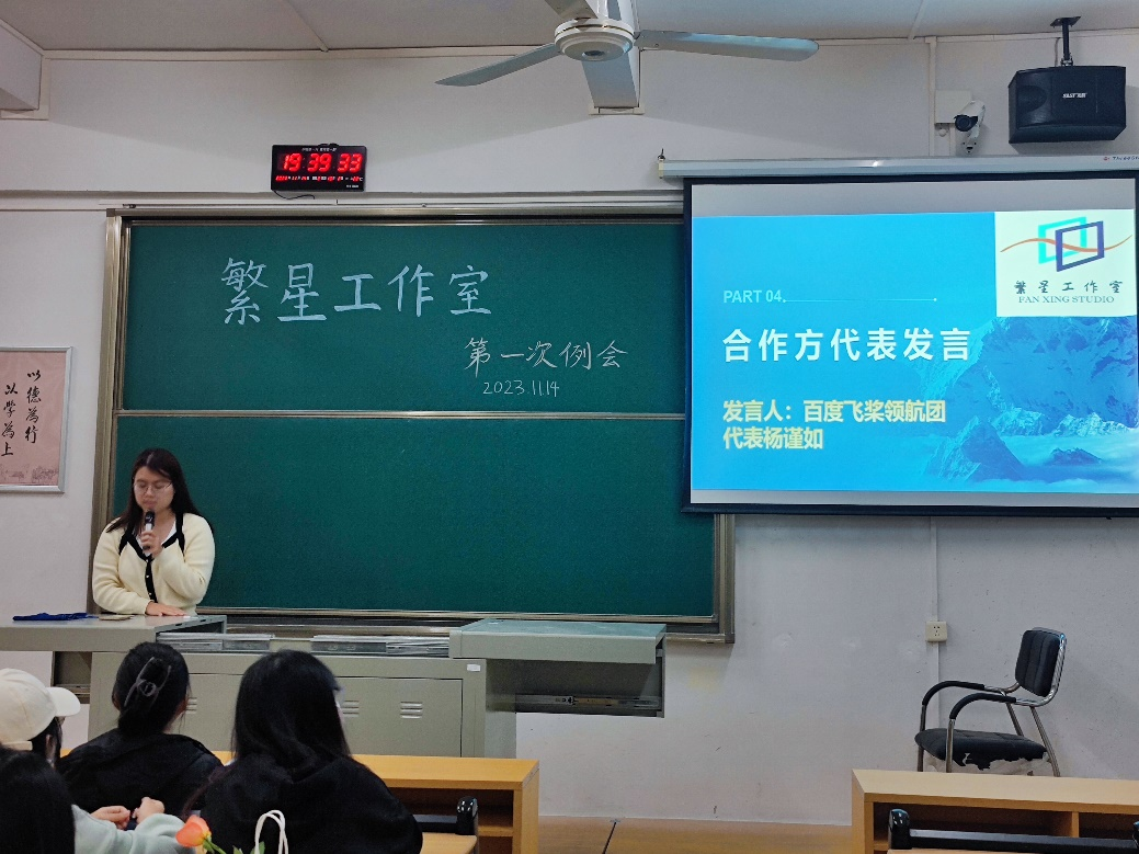 【本网讯】11月14日晚,繁星工作室于二教D502开展本年度第一次例会。繁星工作室指导老师左文涛、繁星工作室上任会长吴晓丽、百度飞桨领航团代表杨谨如、繁星工作室会长孙嫦君、各个部门新任部长及干事出席了此次例会。
